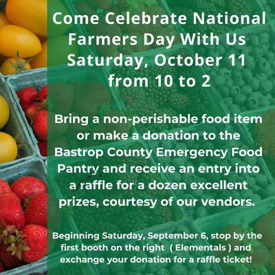 2:00 p.m. We're accepting donations for the Bastrop County Emergency Food Pantry. You can bring your donation or non-perishable food items to exchange for raffle tickets beginning September 6th.